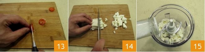 Enquanto os macarons esfriam, prepare o creme de queijos para o recheio. Corte os tomatinhos em fatias do mesmo tamanho no sentido horizontal 13 e reserve-os. Em seguida, corte a mussarela em pequenos cubos de 1 cm de lado 14 e coloque em um processador. Tempere com sal 15 e pimenta.