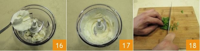 Adicione também o queijo cremoso 16 e bata os ingredientes até obter uma mistura lisa e homogênea 17, que você colocará em uma tigelinha. Depois, lave o manjericão, seque-o delicadamente com um pano limpo e corte em julienne 18.