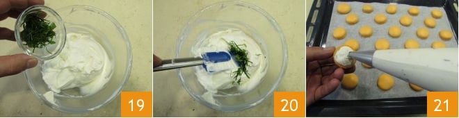 Adicione-o à mistura de queijos 19 e misture com uma espátula 20. Transfira o creme de queijos para um saco de confeitar com bico liso e coloque-o sobre a parte plana de uma concha de merengue 21.
