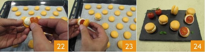 Acima do creme, coloque uma fatia de tomate 22, depois coloque sobre ela uma segunda concha de merengue 23. Repita a operação para todas as conchas disponíveis até compor os 35 macarons. Neste ponto, seus macarons caprese estão prontos para serem servidos para um delicioso aperitivo 24!