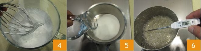 Ligue a batedeira em velocidade média e bata as claras em neve firme 4. Enquanto isso, em uma panela, derreta o açúcar com a água em fogo baixo 5. Mexa os ingredientes para permitir que o açúcar derreta de maneira uniforme e evitar a formação de grumos. Aqueça até atingir uma temperatura de 118º (você pode verificar com um termômetro de cozinha) 6.