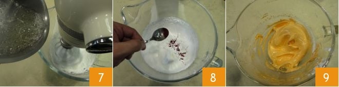 Neste ponto, despeje a calda nas claras em neve 7. Continue misturando bem os ingredientes com a batedeira até que as claras estejam em neve firme e a mistura esteja fria. Em seguida, pare a batedeira e adicione o corante amarelo e vermelho 8. Mexa delicadamente com uma espátula ou com a batedeira em velocidade baixa até obter uma coloração homogênea, tomando cuidado para não desmontar as claras 9.