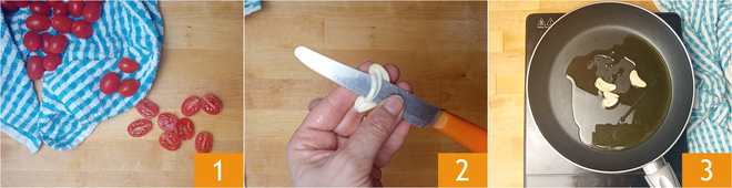 Para preparar os fusilli com atum e tomatinhos, prepare primeiro o molho. Lave, seque e corte os tomatinhos ao meio 1. Descasque o alho, divida-o ao meio e remova o miolo central 2. Transfira os dentes de alho para uma frigideira com um fio de azeite e deixe dourar 3.