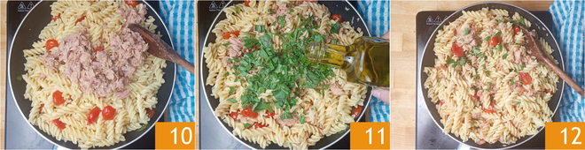 Misture, adicione o atum 10, a salsinha, o manjericão e uma colher de azeite extravirgem 11. Misture bem, desligue o fogo e sirva 12.