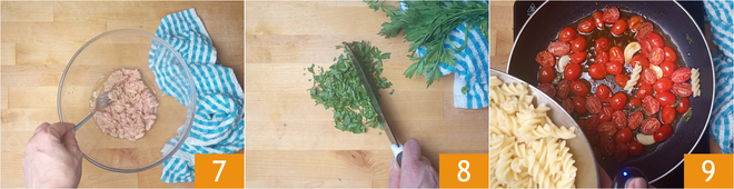 Transfira o atum para uma tigela e desfie-o com um garfo 7. Em seguida, pique a salsinha 8 e rasgue as folhas de manjericão à mão. Assim que o macarrão estiver cozido, escorra-o e transfira-o para a frigideira com os tomatinhos 9.