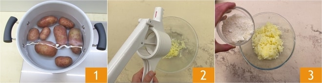 Para preparar a massa com creme de batatas e linguiça, comece cozinhando as batatas inteiras por cerca de 40 minutos 1, ou até que estejam macias. Com o espremedor de batatas, reduza-as a um purê 2, em seguida, adicione o Parmigiano Reggiano DOP ralado 3.