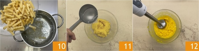 Enquanto isso, cozinhe a massa pelo tempo indicado na embalagem 10. Enquanto cozinha, amoleça a mistura de batatas e açafrão com água do cozimento 11, depois bata com o mixer de imersão 12.