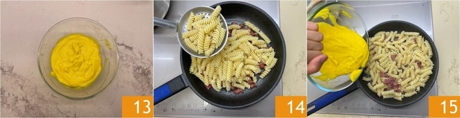 Você deve obter um creme liso e bastante fluido 13. Escorra a massa na frigideira com a linguiça 14, adicione o creme de batatas 15.