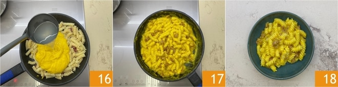 Adicione também uma concha de água do cozimento 16, ou o suficiente para diluir e misturar o molho 17. A massa com creme de batatas e linguiça está pronta para ser saboreada 18!