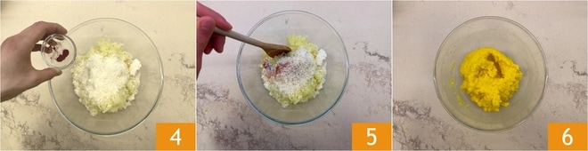 Adicione açafrão em pó 4, sal e pimenta. Misture 5 para obter uma mistura bastante encorpada e homogênea 6.