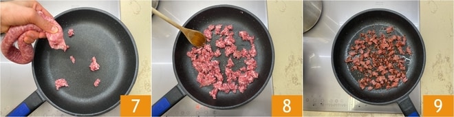 Retire a pele da linguiça, esfarele-a e coloque-a em uma frigideira levemente aquecida (sem adicionar gordura) 7. Deixe dourar por alguns minutos, mexendo frequentemente 8 até que fique dourada 9.