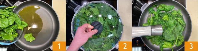 Para preparar o macarrão com creme de espinafre e guanciale crocante, primeiro tempere o dente de alho com o azeite numa frigideira grande. Em seguida, adicione os espinafres 1 e tampe 2. Cozinhe por cerca de 5 minutos, depois adicione sal 3.