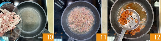 Enquanto a massa cozinha, cuide do guanciale: corte-o em tiras, depois coloque-o numa frigideira quente 11. Cozinhe em fogo médio sem adicionar gordura 11. Quando estiver bem dourado, escorra 12.