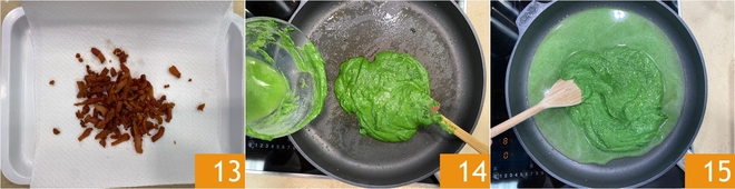 Transfira o guanciale para um prato com papel toalha 13. Despeje o creme de espinafre na mesma frigideira que você usou para cozinhar os espinafres 14. Adicione uma concha de água de cozimento da massa e mexa para diluí-la 15.