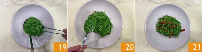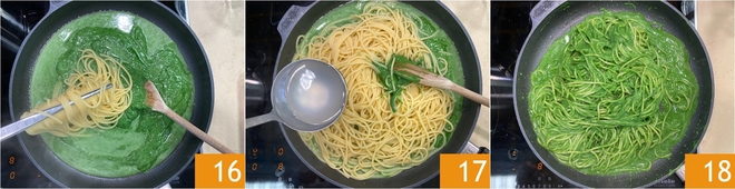 Escorra a massa al dente e transfira diretamente para o molho 16. Se necessário, adicione mais uma concha de água 17 e salteie bem tudo 18.