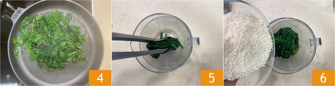 Continue cozinhando por mais alguns minutos sem tampa para evaporar bem o líquido 4, depois deixe esfriar um pouco. Transfira os espinafres para o copo do liquidificador 5 e adicione o Parmigiano Reggiano ralado 6.