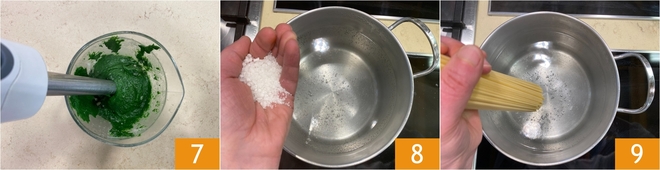 Bata com um mixer de imersão até obter um creme liso e homogêneo 7. Reserve. Coloque no fogo uma panela cheia de água para cozinhar a massa e adicione sal 8; assim que ferver, adicione o espaguete 9.