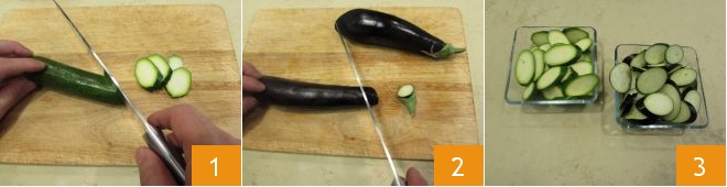 Para preparar a massa com legumes grelhados, comece grelhando os legumes. Assim, depois de lavar e secar as abobrinhas, retire as duas extremidades com uma faca bem afiada e, em seguida, corte em rodelas com aproximadamente meio centímetro de espessura 1. Para ter fatias da mesma espessura, corte em diagonal. Logo em seguida, faça o mesmo com as berinjelas 2 para já ter prontos os ingredientes a serem grelhados 3.