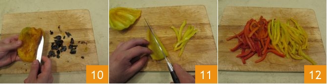 Quando estiverem completamente descascados 10, corte-os em tiras finas 11, fazendo o mesmo com ambos os pimentões 12.