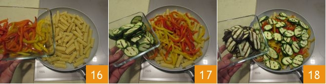 Na massa, adicione também os legumes grelhados previamente, ou seja, os pimentões 16, as abobrinhas 17 e as berinjelas 18 e deixe misturar todos os sabores por alguns instantes, cozinhando em fogo alto.