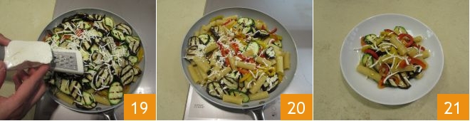 Por fim, apague o fogo e rale o queijo primosale 19, ajuste o sal e a pimenta se necessário e misture para que a massa ainda quente amoleça ligeiramente o queijo 20. Finalmente, escolha se deseja servir a massa com legumes grelhados ainda bem quente ou saboreá-la fria. Nesse caso, deixe esfriar bem em temperatura ambiente e, em seguida, coloque na geladeira por pelo menos meia hora: assim, absorverá os sabores e ficará bem fria 21!