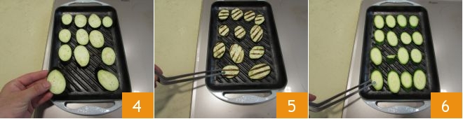 Aqueça bem uma grelha e, em seguida, disponha as rodelas de berinjelas primeiro, pois tendem a escurecer rapidamente uma vez cortadas 4, e deixe cozinhar por cerca de 30 segundos de cada lado 5. Assim, ficarão levemente crocantes por fora, mas macias por dentro. Repita com as abobrinhas, dispondo as rodelas na grelha bem quente 6.
