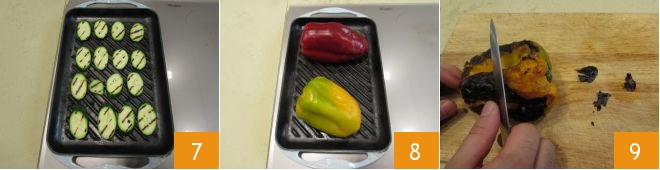 e após cerca de 30 segundos, vire para continuar o cozimento do outro lado 7. Reserve os dois legumes recém-grelhados e dedique-se aos pimentões. Depois de lavá-los e secá-los, grelhe-os na chapa até que fiquem bem macios e assados 8: dessa forma, você conseguirá remover facilmente a pele apenas com uma faca, sendo a parte mais indigesta 9.