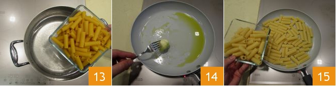 Cozinhe a massa em bastante água fervente e salgada 13 e, enquanto cozinha, coloque óleo em uma frigideira junto com o alho descascado e deixe apurar por alguns minutos 14. Quando a massa estiver cozida al dente, escorra e coloque na frigideira para deixar apurar o sabor 15.