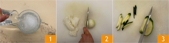 Para preparar o macarrão de soja salteado, coloque o macarrão de molho em água morna por 30 minutos, melhor ainda se deixados uma noite inteira em água fria 1. Limpe e fatie a cebola 2, corte as abobrinhas em tiras 3.