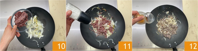 Adicione a carne moída 10, sal 11, pimenta e salteie por alguns instantes, então doure e deglaceie com o vinho de arroz 12.