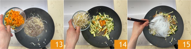 Adicione também os legumes 13 e os brotos de soja 14. Escorra aqui o macarrão demolhado 15, adicione também a água. Misture para dar sabor.