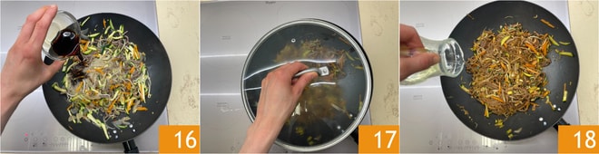 Agora despeje o molho de soja escuro 16 e depois o claro. Despeje a água, misture novamente para combinar, cubra com a tampa 17 e cozinhe por 5 minutos. Por último, adicione um fio de óleo de sementes 18.