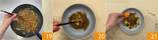 Salteie mais uma última vez 19, sirva o macarrão de soja 20 enfeitando os pratos com flores comestíveis 21.