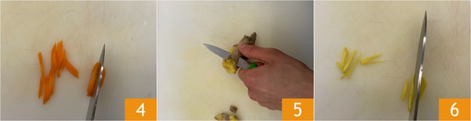 Limpe e corte as cenouras em tiras também 4. Descasque o gengibre 5 e corte em tiras 6.