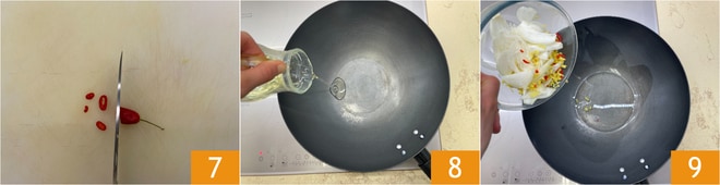 Corte o pimentão em tiras 7. No wok, despeje um fio de óleo 8, adicione aqui as cebolas, o gengibre e o pimentão 9. Deixe murchar por alguns minutos.