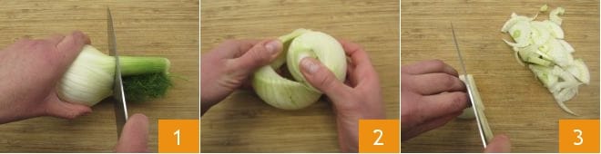 Para preparar o macarrão gratinado com erva-doce e bechamel, coloque uma panela com bastante água para ferver, que você usará para cozinhar o macarrão. Quando ferver, adicione sal. Em seguida, passe para a erva-doce: remova a extremidade superior 1 e inferior, retire a camada mais externa 2 e corte a erva-doce em fatias finas 3. No total, você deve obter cerca de 290 gramas de erva-doce limpa. Reserve.