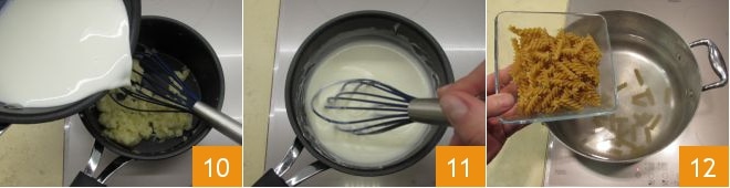 Em seguida, adicione o leite aos poucos, continuando a mexer com um batedor 10. Deixe a mistura engrossar em fogo médio, sem parar de mexer, até obter um bechamel liso e uniforme 11. Desligue o fogo e mantenha-o temporariamente reservado. Quando a água para cozinhar o macarrão estiver fervendo, adicione sal e cozinhe o macarrão por cerca de 8 minutos (você deve cozinhá-lo al dente) 12.
