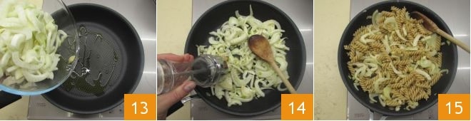 Enquanto isso, aqueça um fio de azeite em uma frigideira junto com um dente de alho amassado com casca, adicione a erva-doce 13, tempere com sal e pimenta 14 e cozinhe em fogo médio por cerca de 5 minutos, de modo que ainda fiquem crocantes. Após o tempo indicado, retire o alho, escorra o macarrão diretamente na frigideira com a erva-doce, misture bem 15 e salteie tudo por 1 minuto em fogo médio.