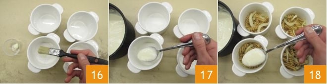 Unte 4 cocottes com diâmetro de 10 cm 16 e cubra a base com uma colher de bechamel 17, depois preencha as formas até a metade com o macarrão e a erva-doce e adicione mais 2 colheres de bechamel para cada cocotte 18.