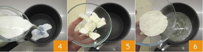 Prepare o bechamel: aqueça o leite em uma panela pequena 4 e derreta a manteiga em fogo baixo em uma outra panela 5. Quando a manteiga estiver derretida, adicione a farinha de uma só vez 6.