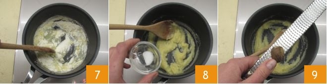e misture bem para evitar a formação de grumos 7 até obter um roux dourado. Neste ponto, adicione o sal 8 e a noz-moscada ralada 9 (ou você pode adicioná-los uma vez que o bechamel estiver pronto).