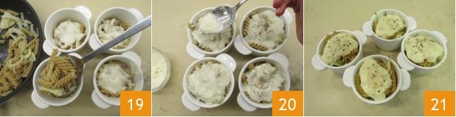 Adicione mais macarrão até chegar à borda das formas 19 e complete com bastante bechamel, uma pitada de pimenta e uma colher de Parmesão ralado 20. Asse as cocottes em forno pré-aquecido a 200° por cerca de 10 minutos até ficarem bem douradas na superfície. Seu macarrão gratinado com erva-doce e bechamel está pronto para ser servido bem quente 21!