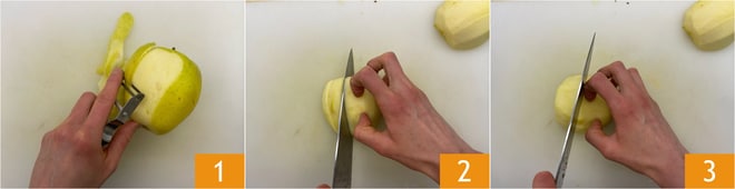 Para preparar as maçãs na fritadeira de ar, primeiro descasque as maçãs 1, depois corte-as ao meio e retire o miolo central. Divida as metades das maçãs em mais fatias 2, depois corte-as transversalmente ao meio 3.