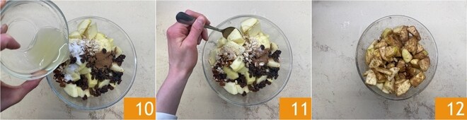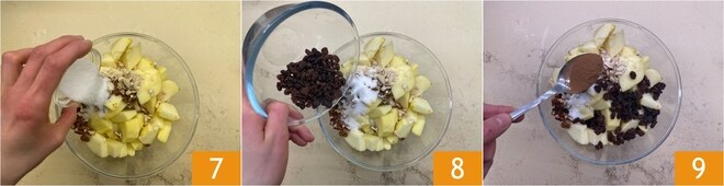 Adicione o açúcar 7, as uvas-passas 8 e a canela em pó 9.