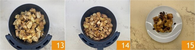 Transfira as maçãs para o cesto da fritadeira de ar (utilizamos uma fritadeira com capacidade de 6 litros) 13 e cozinhe a 200° por 20 minutos 14. Deixe amornar e sirva suas maçãs cozidas na fritadeira de ar 15!
