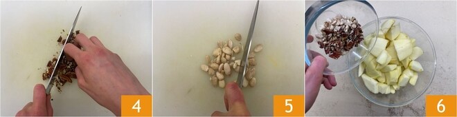 Pique grosseiramente as nozes pecan 4 e as amêndoas 5. Em uma tigela, junte as maçãs e o picado de frutas secas 6.