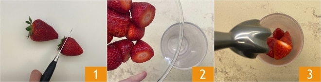 Para preparar as madeleine de morango, primeiro lave os morangos e retire as folhas 1, depois coloque-os em um copo 2 e bata com um mixer de imersão 3.