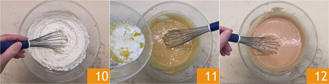 Incorpore os ingredientes secos com o batedor 10, depois adicione a manteiga derretida 11 e misture tudo 12. Cubra com filme plástico e deixe a massa descansar na geladeira por 30 minutos.