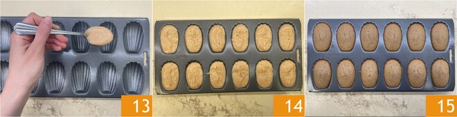 Após este tempo, unte a forma de madeleine e preencha cada cavidade com uma colher rasa de massa 13. Asse em forno estático pré-aquecido a 200° por cerca de 12 minutos 14. Uma vez cozidas, retire a forma do forno 15.