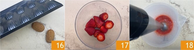 Desenforme as madeleine ainda quentes batendo levemente a forma 16, depois deixe esfriar. Enquanto isso, prepare a cobertura: retire as pontas dos morangos 17 e bata com o mixer de imersão 18.